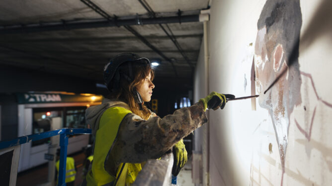 Transdev’s light rail in Barcelona pays tribute to tram passengers with a mural by Elisa Capdevila