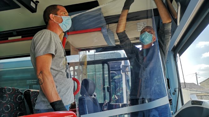 En Normandie, nos équipes ont installé toutes les mesures sanitaires nécessaires : affichage des gestes barrières, condamnation de certains sièges, pose de distributeurs de gel hydroalcoolique et bâche de protection pour les conductrices et conducteurs.