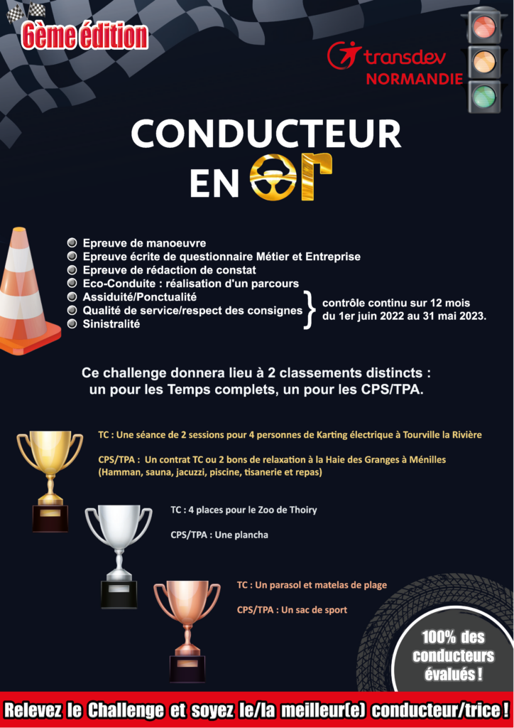 Ce challenge interne organisé pour l’ensemble des conducteurs.trices permet d’élaborer le plan de formation sur l’année et comporte 7 critères de sélection : manœuvres, QCM métier et entreprise, constat, éco-conduite et contrôle continu sur les thématiques assiduité / ponctualité, qualité de service et sinistralité.