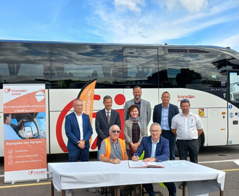 En présence de Nicolas Daragon, Maire de Valence et Vice-président du Conseil régional Auvergne-Rhône-Alpes et de Ludovic Jourdain, Directeur régional Transdev AURA, David Rituper, Directeur de territoire Transdev et Noël Barriol, Directeur de Transdev Drôme ont eu le plaisir de signer officiellement la convention de partenariat avec Jean-Pierre Serafini, Président de la Banque Alimentaire Ardèche-Drôme.