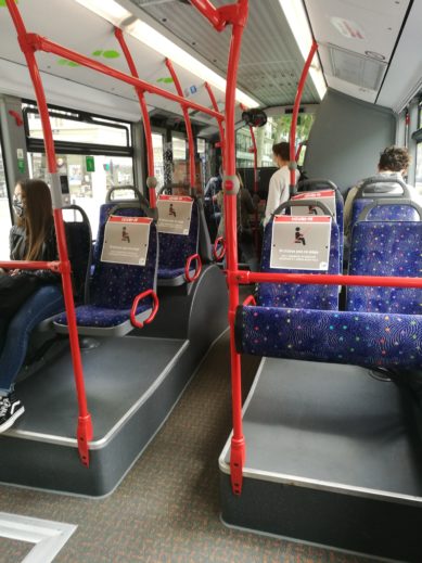 Afin d’accompagner la distanciation physique, une signalétique spécifique a été mise en place dans les véhicules, aux arrêts, mais aussi dans les agences. À bords des véhicules, un siège sur deux est également condamné afin de respecter le mètre de distance entre chaque passager.