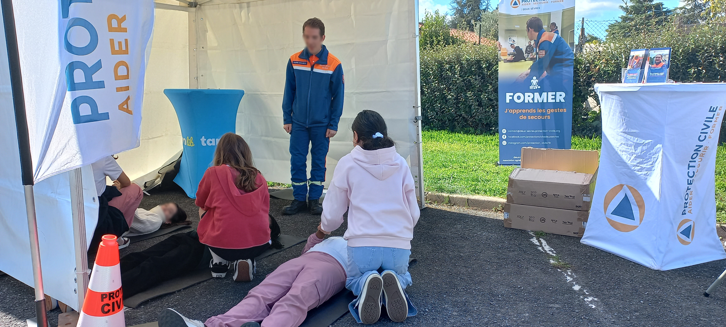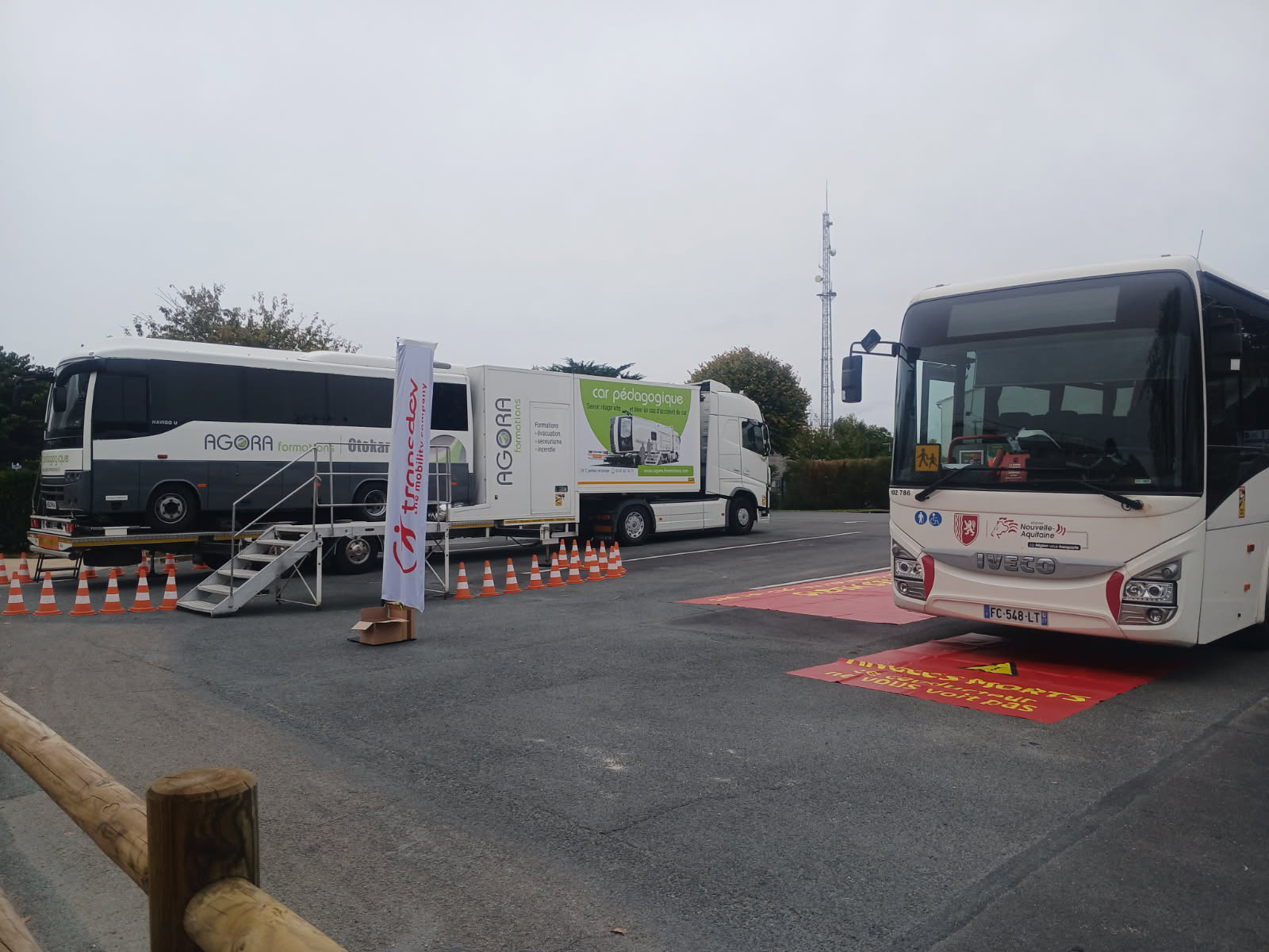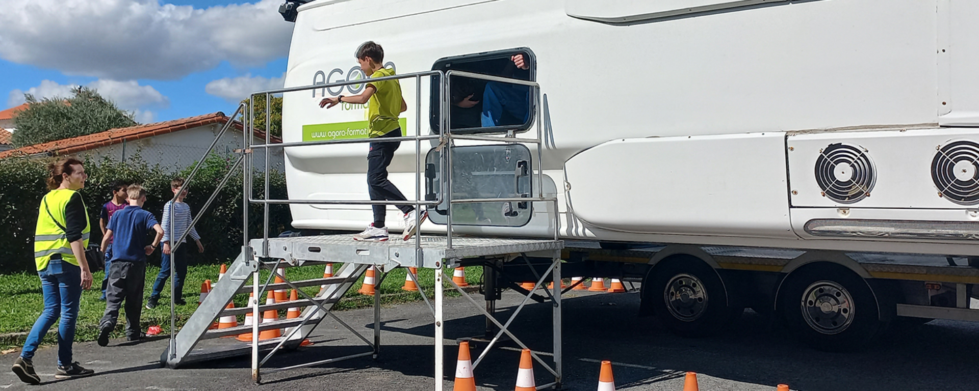 Pour marquer les esprits, les élèves ont vécu une expérience immersive à bord du car pédagogique Agora, capable de simuler un accident en se couchant sur le flanc. Les participants ont alors dû évacuer le véhicule par les trappes situées sur le toit. Ils ont également participé à des ateliers pratiques : sensibilisation aux angles morts, quiz sécurité, et gestes de premiers secours animés par la Protection Civile.