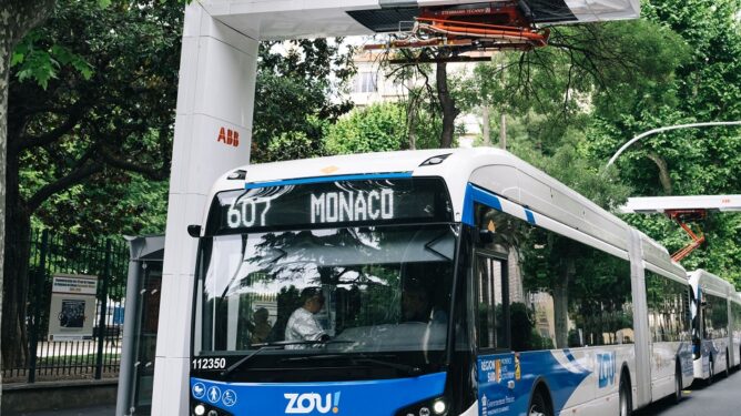 Une première en France par Transdev : Des pantographes inversés pour recharger des bus articulés électriques dans les Alpes Maritimes.